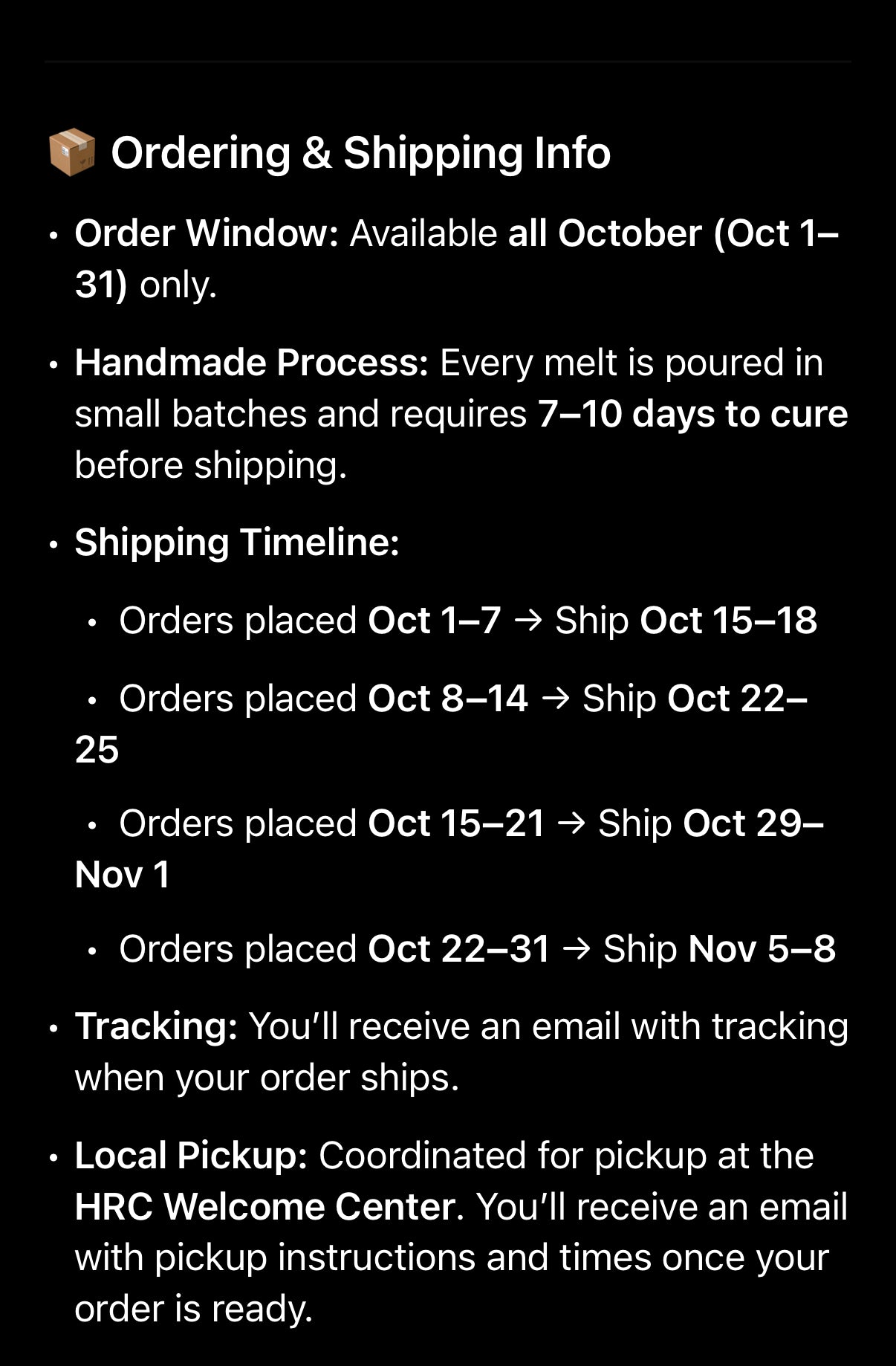 - Handmade Process: Every melt is poured in small batches and requires 7–10 days to cure before shipping.